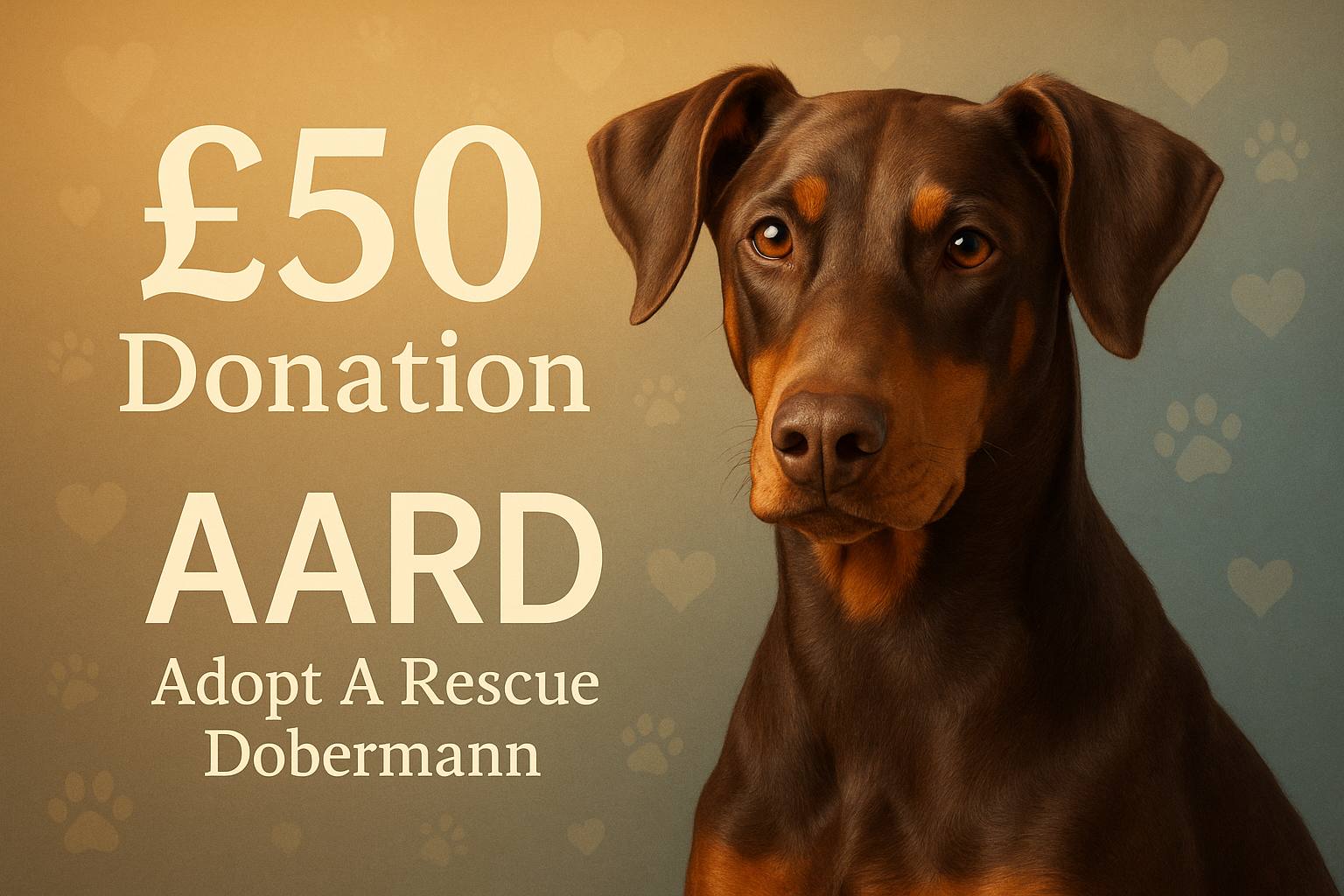 Support our Charity with a £50 donation to Adopt A Rescue Dobermann. Your donation will help us rescue and rehome Dobermanns in need. By donating, you are helping to give these dogs a second chance at a loving home. Your generosity can make a significant impact in the lives of these Dobermanns.